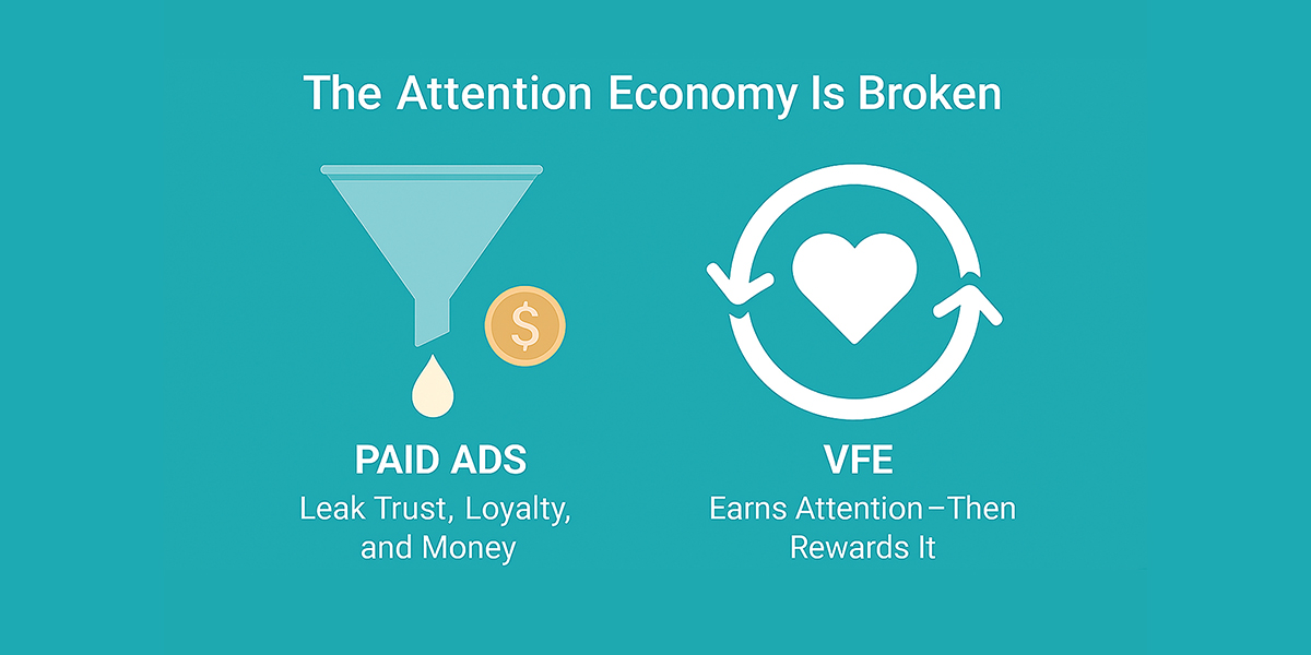 Traditional ads interrupt. VFE invites. Traditional ads track. VFE earns. Traditional ads fade. VFE builds loyalty. This is marketing that rewards attention instead of stealing it. It slashes CAC, deepens connection, and brings joy back to the customer journey. And the best part? It works. It’s fair. And it’s finally here.